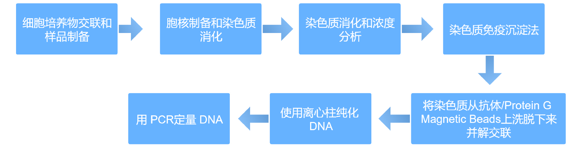 应用简介核酸和蛋白质是组成生命的主要生物大分子,两者的相互作用是构成生命活动的生长、繁殖、运动、遗传和代谢等生命活动的基础。研究蛋白质和核酸间的相互作用是人们探索生命现象奥秘的关键,CHIP检测实验是应用于蛋白与核酸互作关系的重要参考。技术原理CHIP实验在活细胞状态下固定蛋白质-DNA复合物,并将其随机切断为